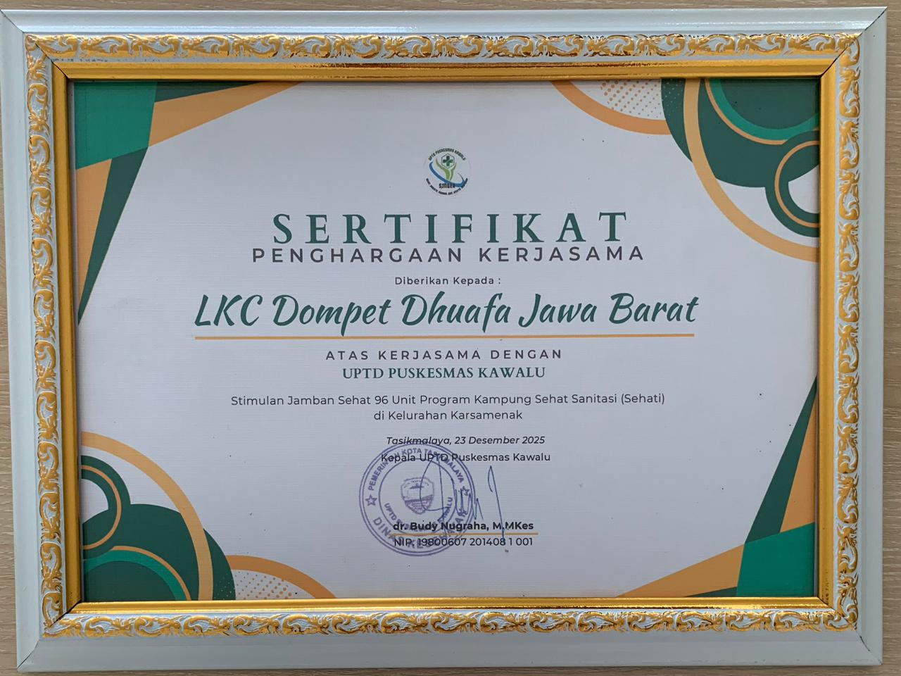 LKCDOMPETDHUAFA.ORG, Tasikmalaya – Layanan Kesehatan Cuma-Cuma (LKC) Dompet Dhuafa Jawa Barat menghadiri agenda penerimaan sertifikat penghargaan atas kolaborasinya dalam Program Kampung Sehat Sanitasi (Sehati) yang berlokasi di Kelurahan Karsamenak, Kecamatan Kawalu, Kota Tasikmalaya pada hari Rabu, 11 Februari 2026.